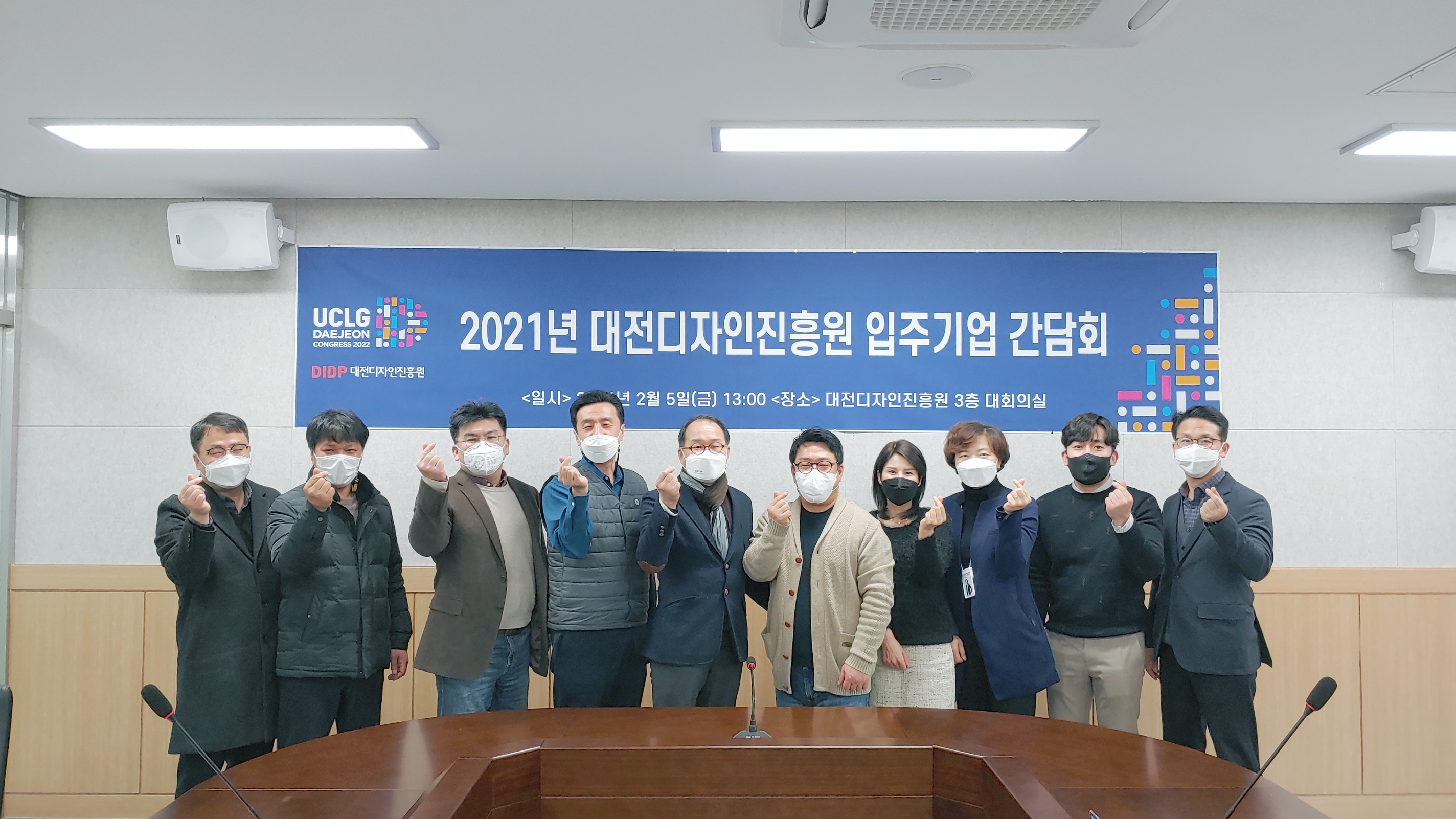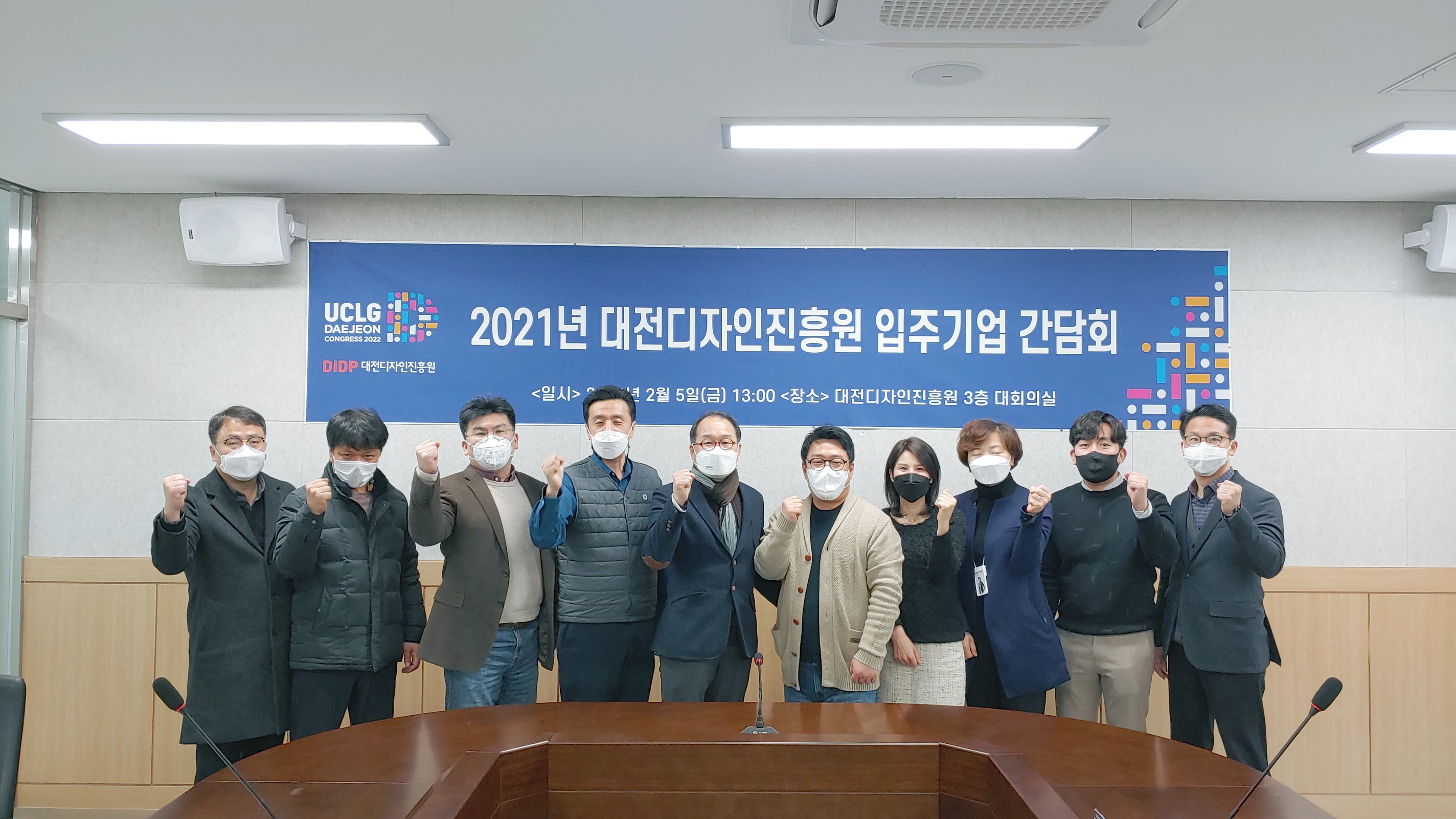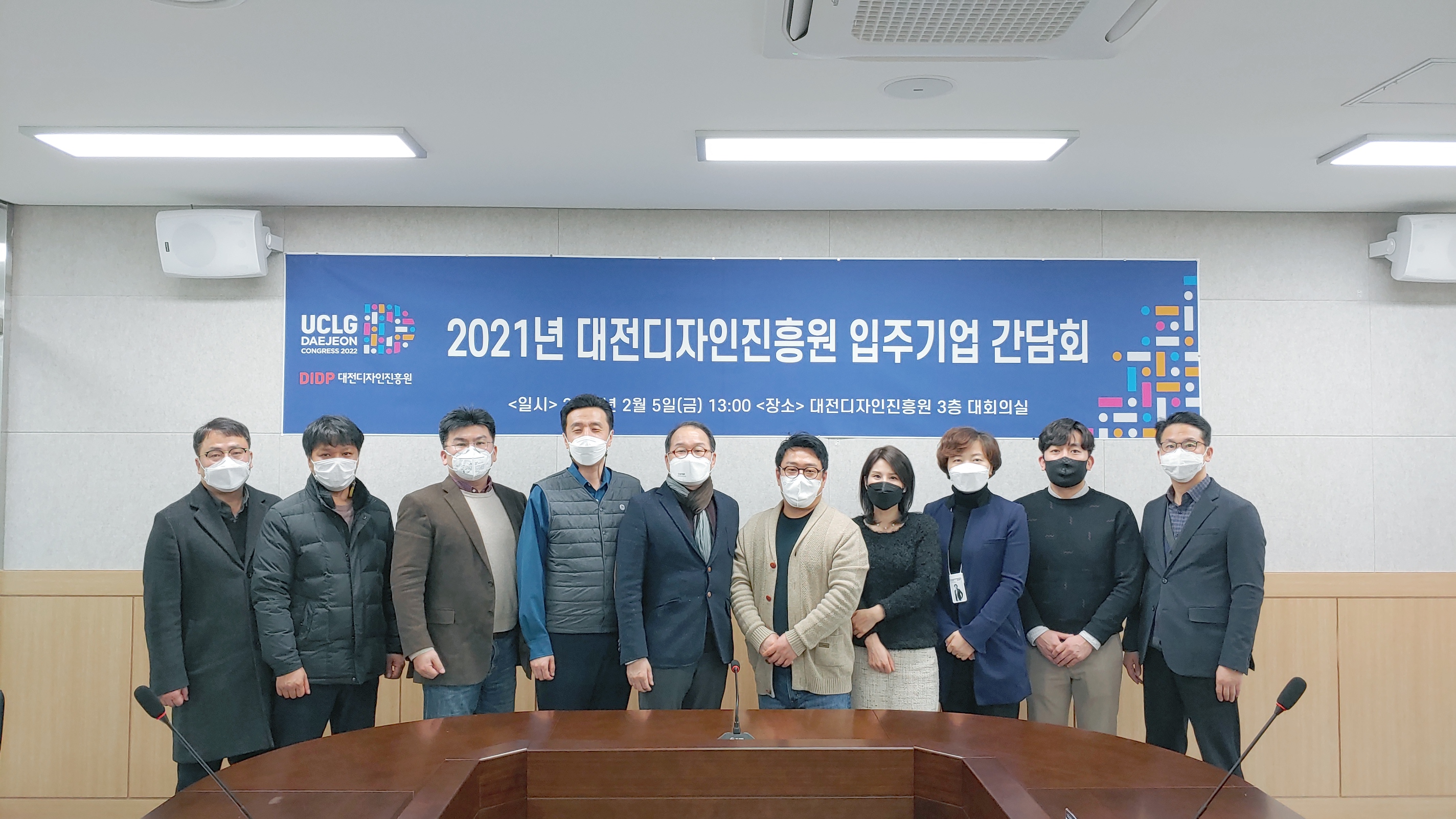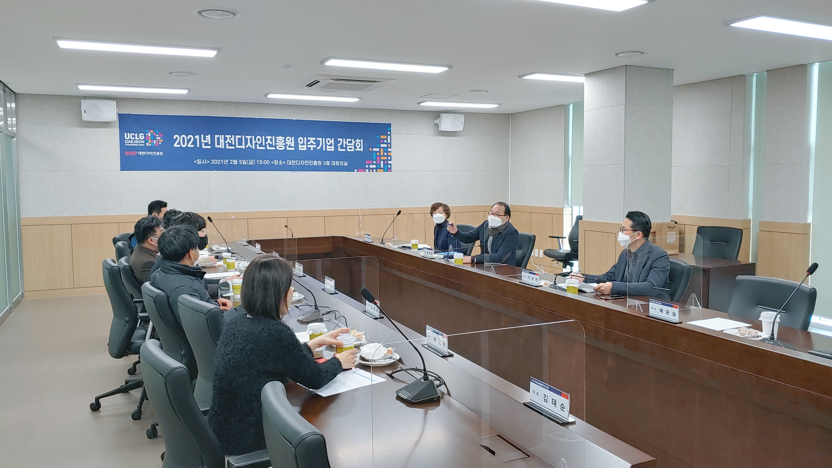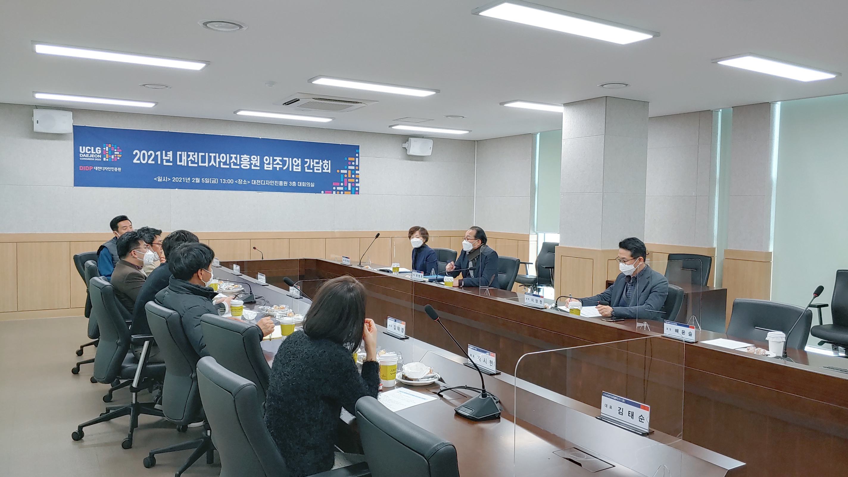 ○ 일시 : 2021.02.05.(금) 13:00~14:00○ 장소 : 대회의실(3층)○ 참석 : 윤병문 원장 등 임직원 4명, 입주기업 대표 7명○ 간담내용 : 대전디자인진흥원 건물 사용에 대한 협의 및 애로사항 청취