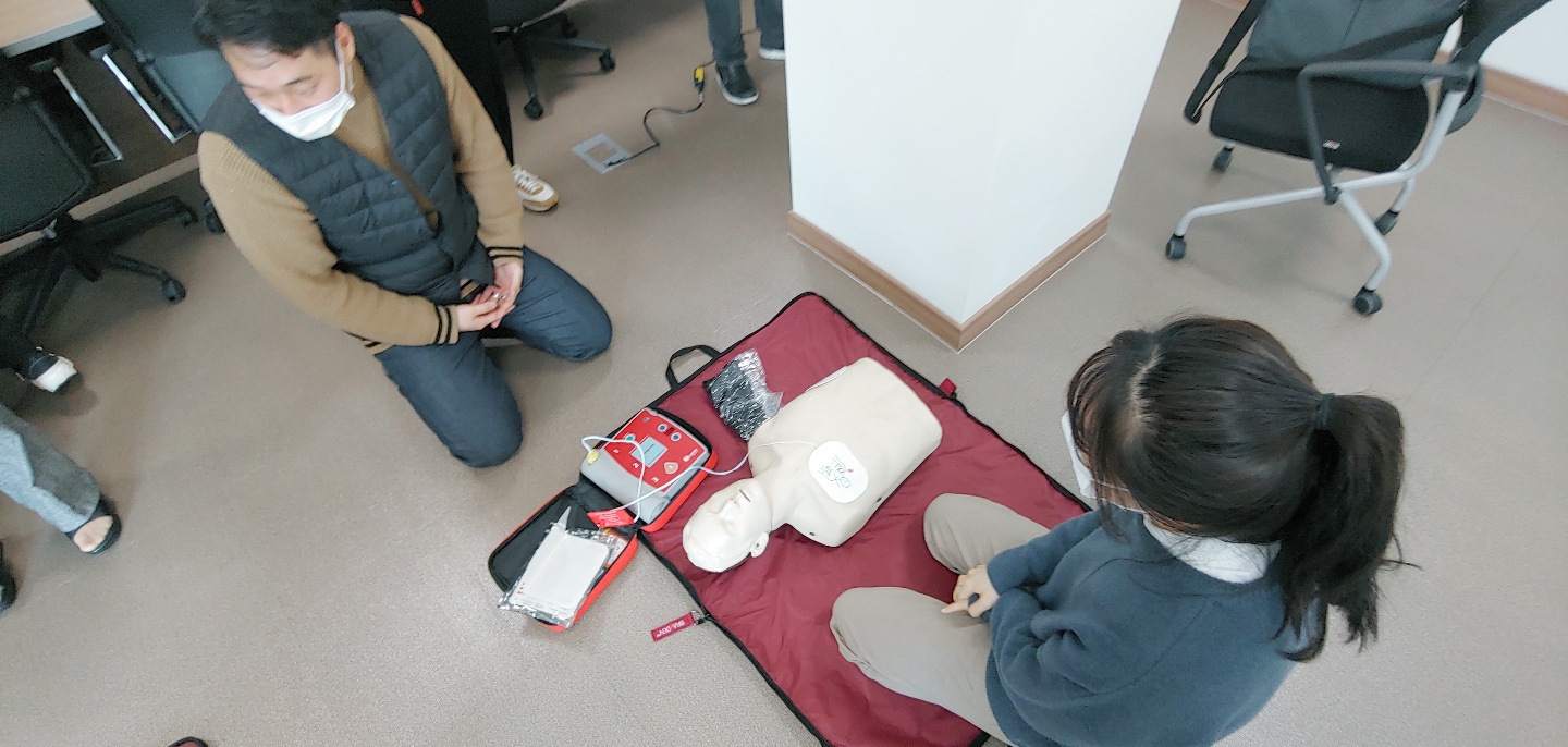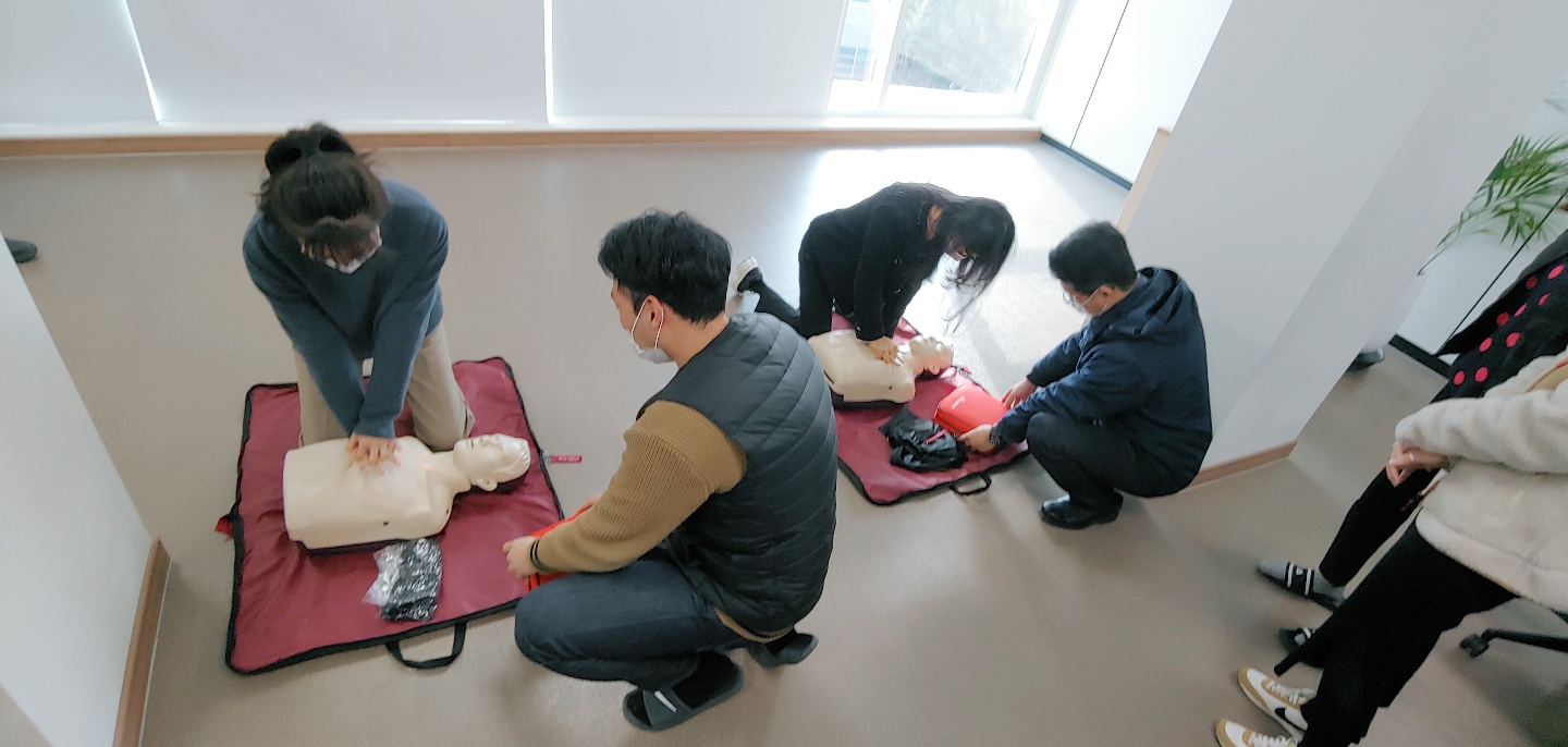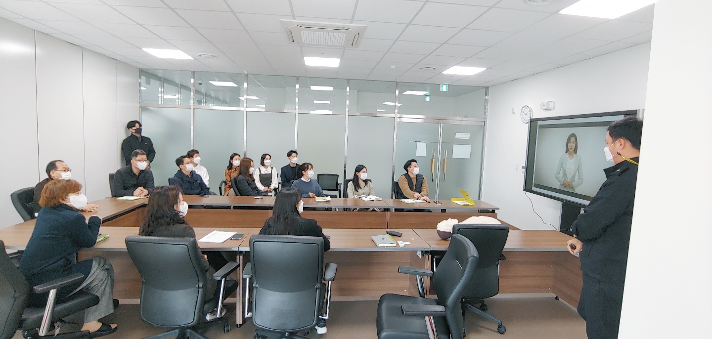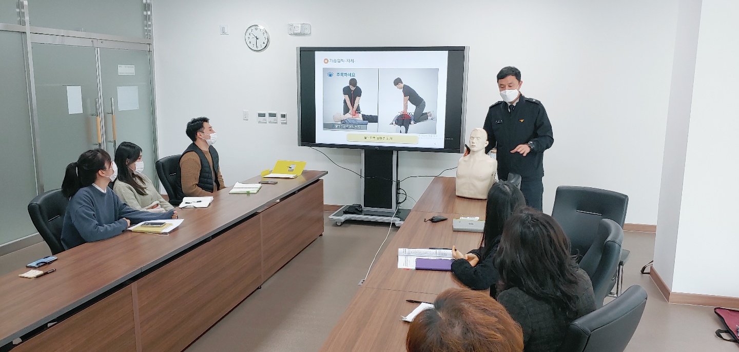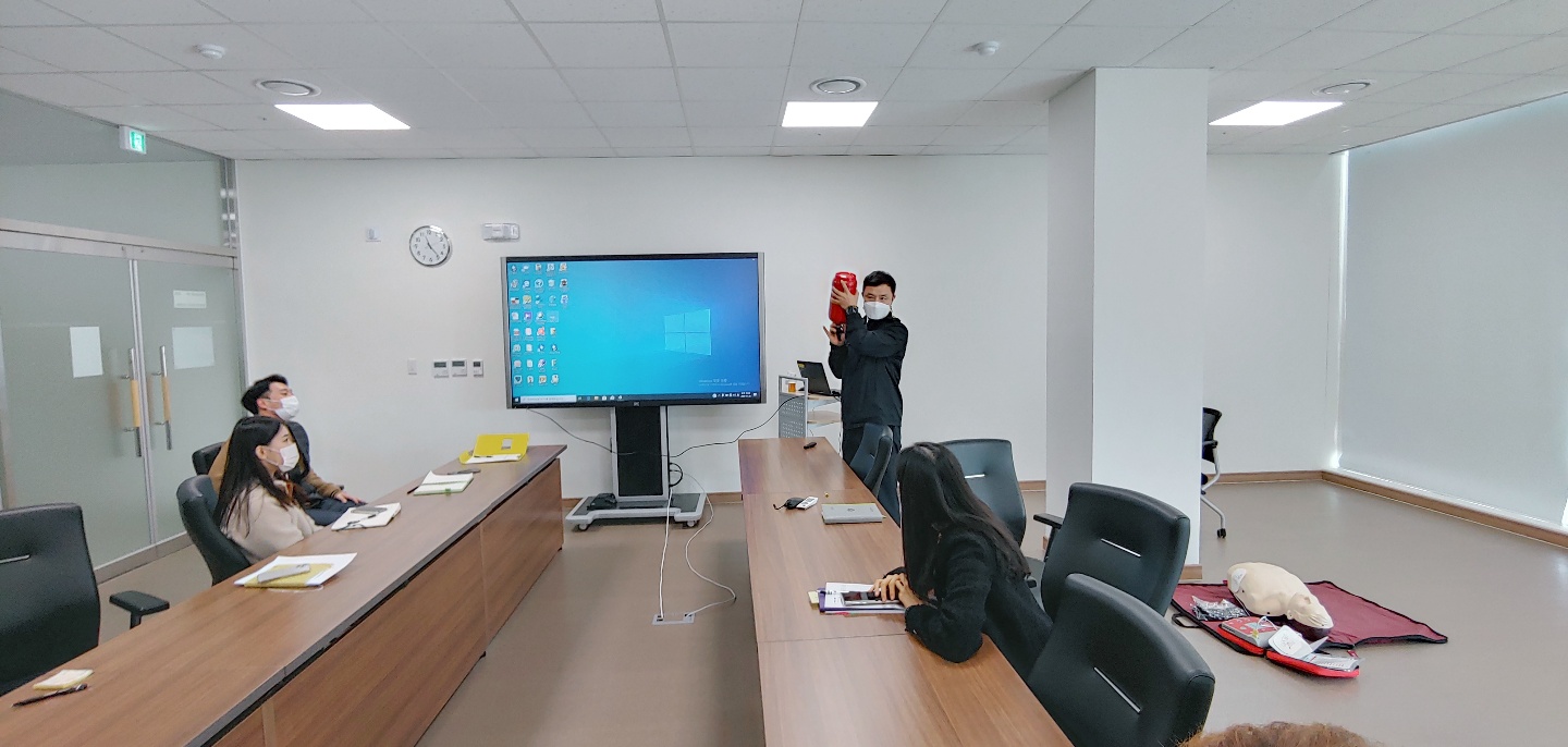 ○ 일시 : 2020.11.26.(목) 10:00~12:00○ 장소 : 중회의실(4층)○ 참석 : 윤병문 원장 등 임직원 14명○ 교육주제 : 사회재난 중 화재 발생시 대피 및 소방기 사용법과 응급상황 시 심폐소생술에 대한 기본지식과 실습을 통해 대처요령 습득